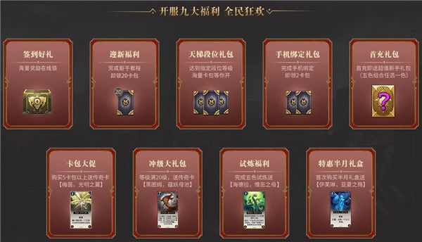 开服伊始,安卓玩家上线完成新手即可领取28个卡包,天梯段位达到白银、黄金、钻石、传说分别再送5、10、15、20卡包!另有天梯印卡、到达等级送橙卡、完成五色试炼送橙卡、半月礼盒送橙卡等九重福利!