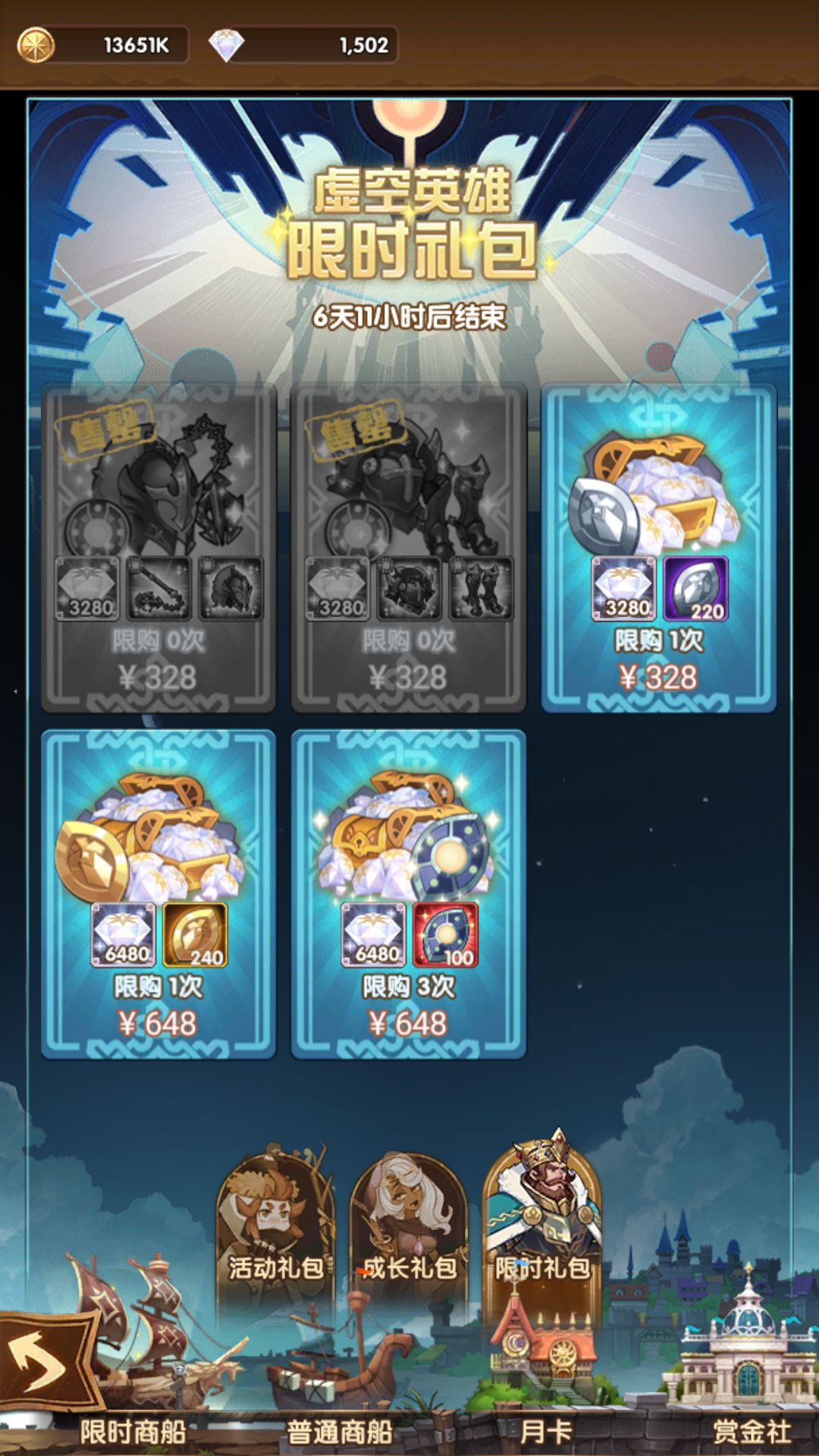 另外限时礼包的价格是跟vip等级挂钩的,等级越高,限时礼包越贵,也有大佬说,他一段时间没有大氪后限时礼包就从648变成328的了……