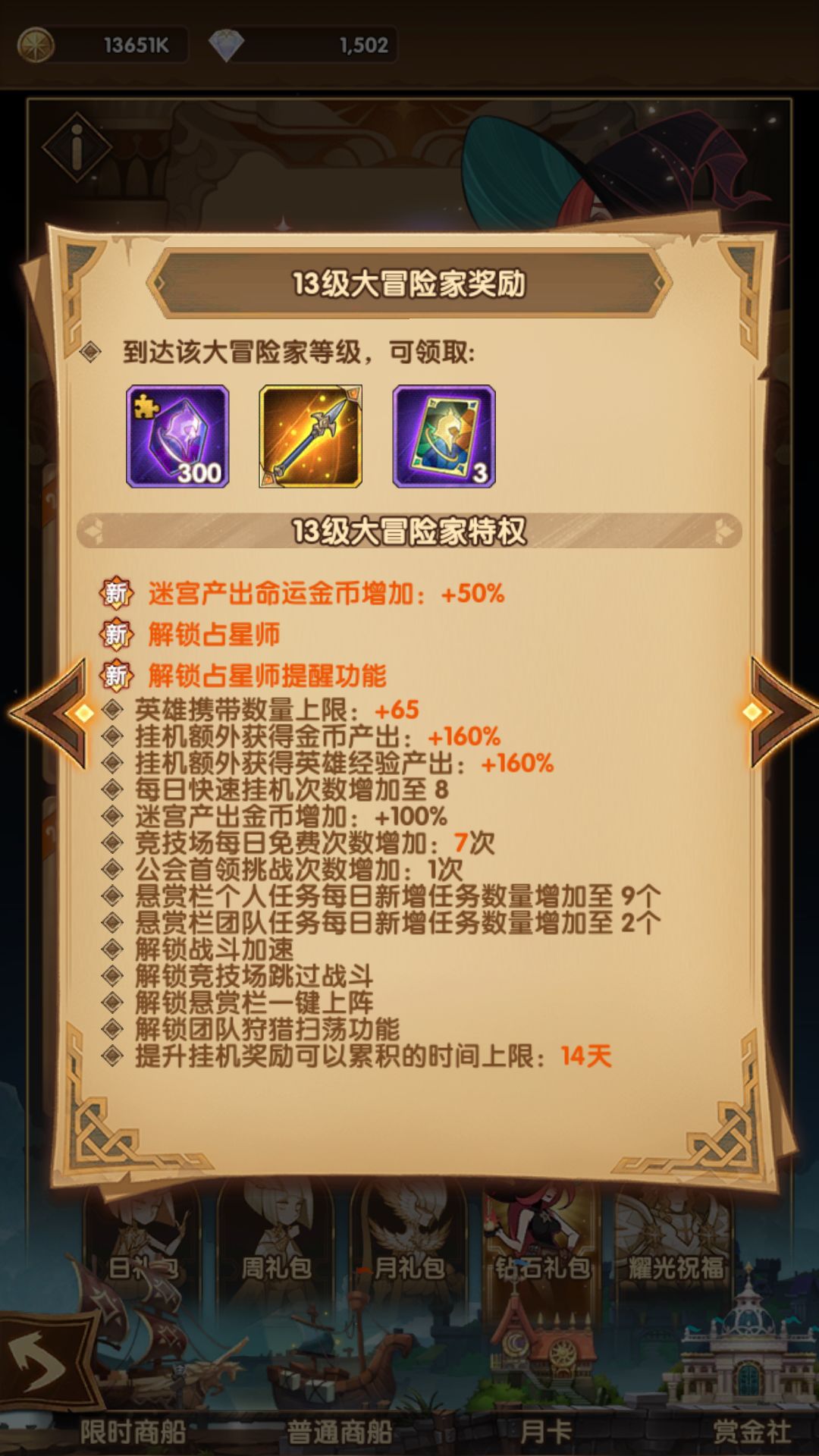 然后就是提前解锁占星(正常16-1解锁)的v13,15w经验,并且加50%迷宫币。