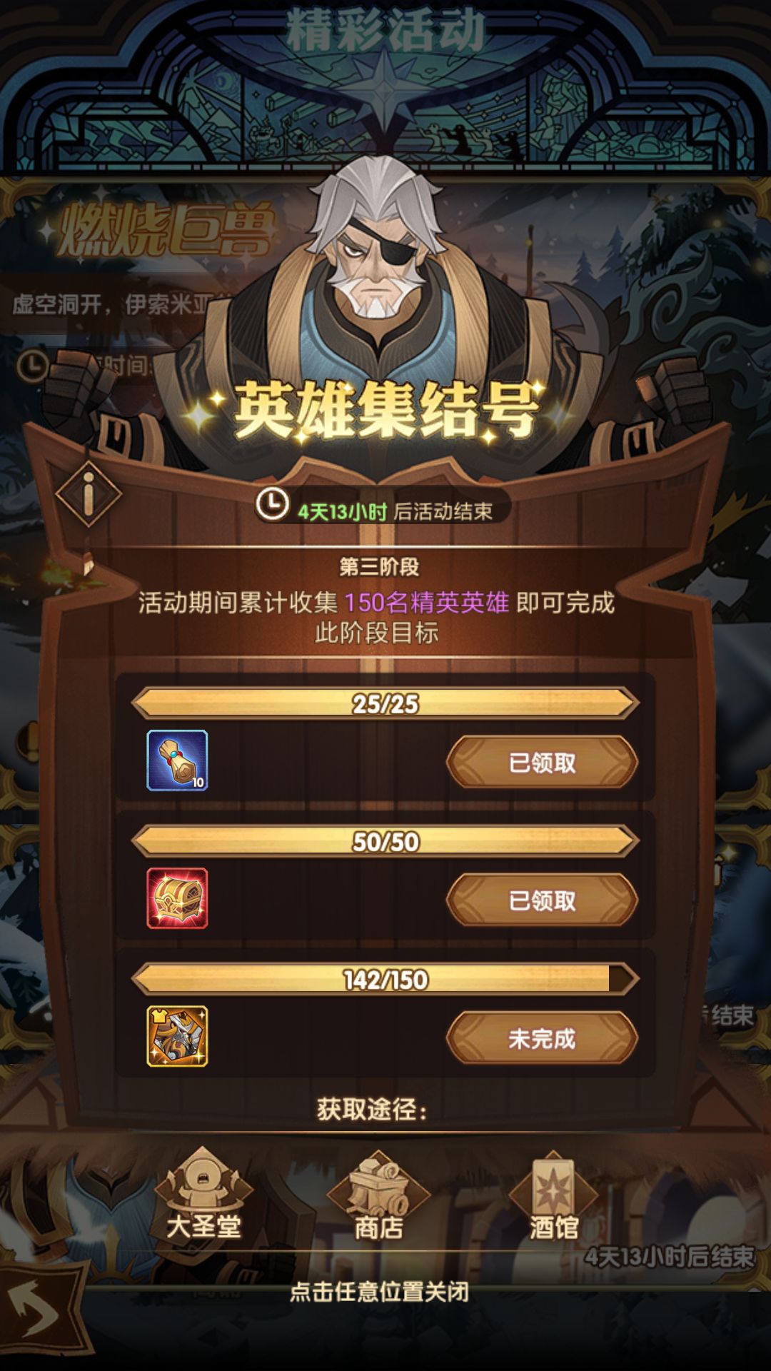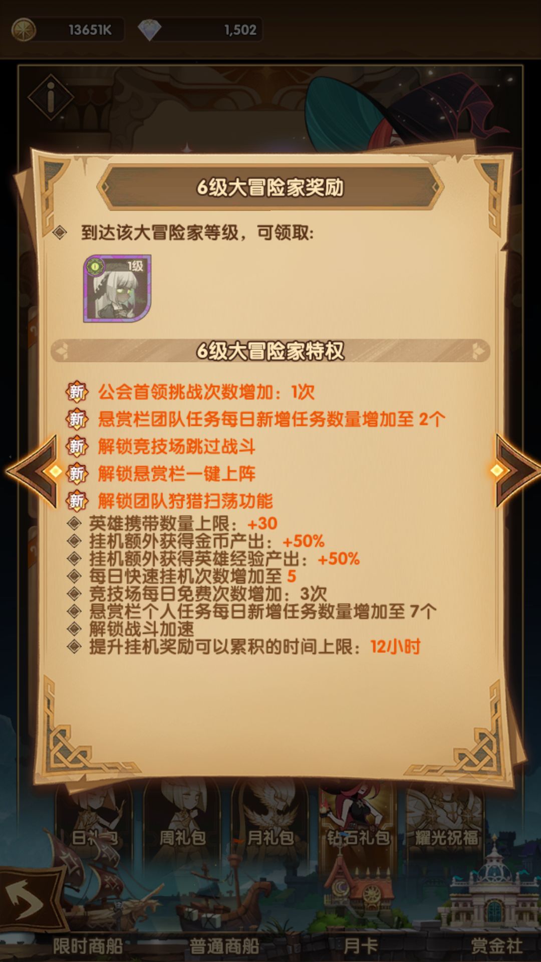 这里要分享的一个技巧是,刚进游戏的第一天,在第一章领了2次挂机奖励后就不领了(做日常),努力推图到19级,同时爬塔,这时一般爬不到50层,大概可以到30+,然后挂一长段时间,或者直接第二天再上(12小时挂满肯定可以)然后领取挂机奖励升上20,礼包先不买,继续推图爬塔,在霍根礼包2小时结束前爬到50层,这时可以两个6r礼包一起买!