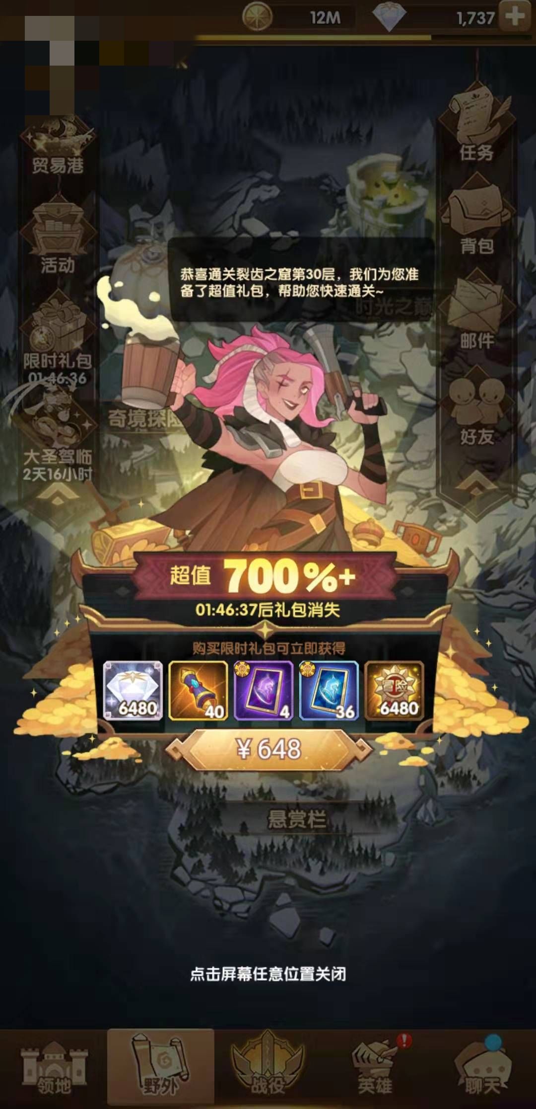 然后先摆个对萌新有用的干货:众所周知,限时礼包一般都比同价格的其他礼包划算,玩家等级20级的6元 60钻+紫霍根 和爬塔50层的6元 60钻+60紫碎(这个是没有争议的性价比mvp),但是你充了霍根的6r大冒险家等级就会涨到v3的样子,这样爬塔50层给的就是30r的礼包了,虽然那个也很值。所以只打算充6r拿首冲奖励的就等到爬到50层再买。