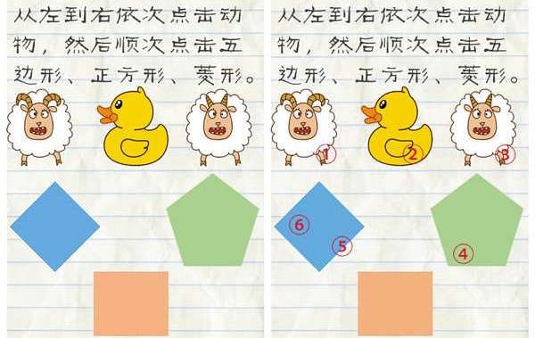 1.从左到右依次点击动物,然后顺次点击五边形、正方形、菱形。按照下图数字顺序点击,即可通关。  第60关攻略: