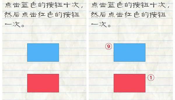 1.点击蓝色的按钮十次,然后点击红色的按钮一次。不要以为屏幕上出现的数字就是点击的次数,自己数好自己点击的次数即可,蓝色十次红色一次。  第35关攻略: