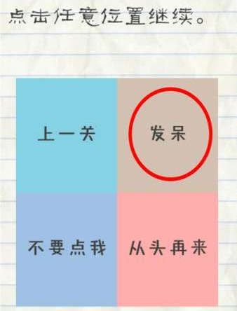 1.点击任意位置继续,只要不停的点击发呆即可通关。  第33关攻略: