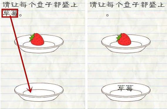 1.让每个盘子都盛上草莓,只要把问题上的草莓拖动到下面的空盘子上,即可通关。  第23关攻略: