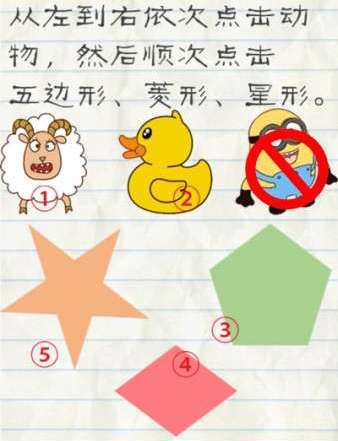 1.从左到右依次点击动物,然后顺次点击五边形、菱形、星形。小黄人不是动物,所以不要点击,按照下图顺序点击即可通关。  第55关攻略: