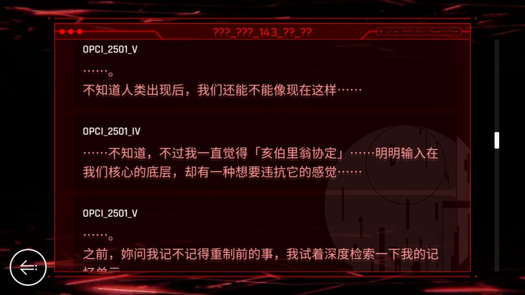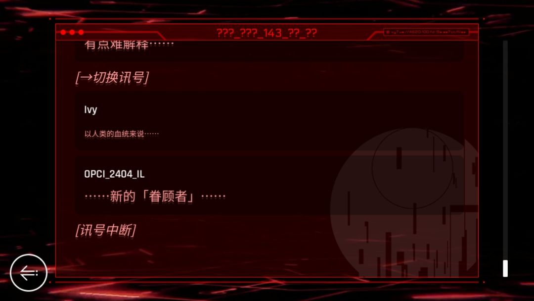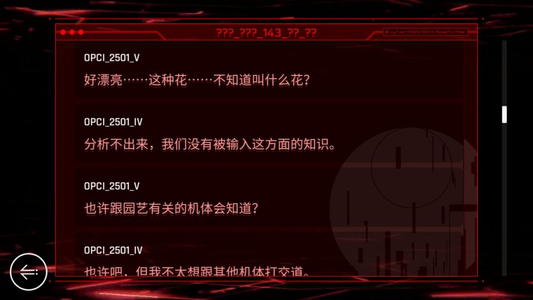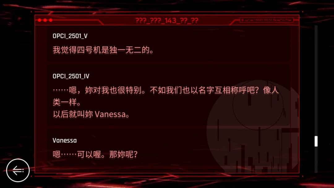 当OPCI_2501_IV再一次翘班的时候,发现OPCI_2501_V也有些不对劲,然后开始了交流。讨论到自己为什么会疲惫,与其他机体的差异,为什么要建造建筑,重制前后的事情,以及对人类的猜想。下次除错时,OPCI_2501_IV带OPCI_2501_V去了它曾经去过的那片湖,为她带上了花,又想到人类的事情和『亥伯里翁』协定,感觉自己想要违背协定。OPCI_2501_V检索记忆查到了自己以前的名字Vanessa,OPCI_2501_IV也为自己取名为Ivy。但当他们谈话时,OPCI_2501_IL在一旁观察他们,称呼他们为新的『眷顾者』。