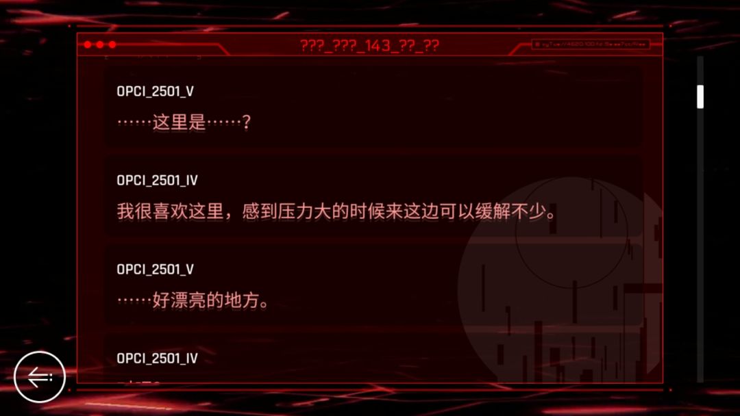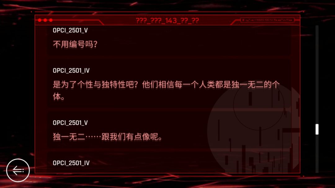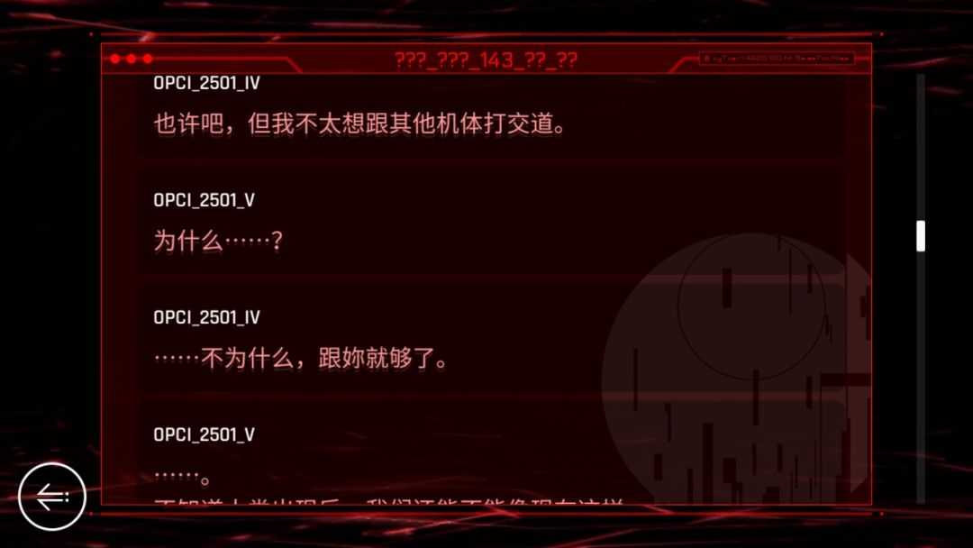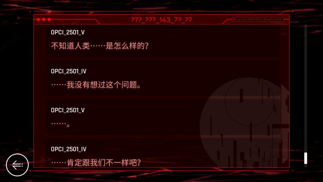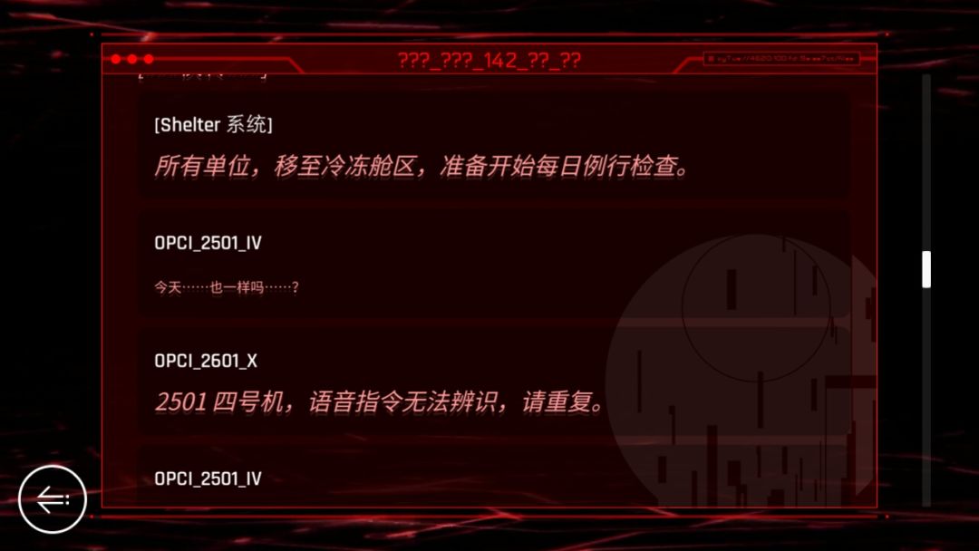 OPCI_2501_IV发现自己重复着日复一日的检查与工作,并且发现其他的机器人也做着一样的事情。它发现自己与其他人不一样,认为是自己出现异常,但检查之后发现自己并没有异常。后来逃掉工作来到了shelter的一个湖边,开始怀疑自己的存在。