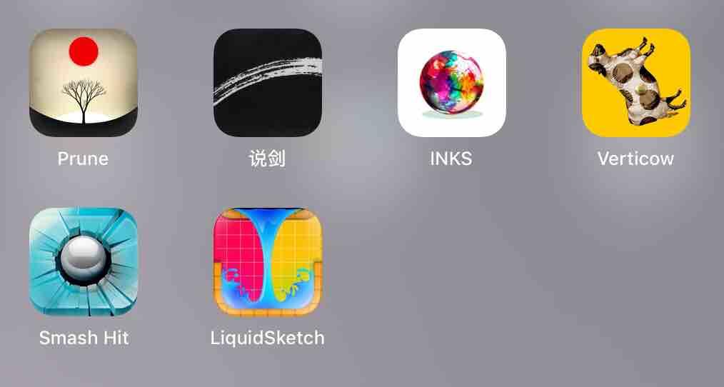 1.通过切割、抛掷、击打、摇晃等动作宣泄情感的游戏该类型游戏有 prune,说剑, INKS,Verticow,smash Hit,LiquidSketch,游戏图标如下图截图所示。你可以在「 Prune」中体验插花剪枝的禅意,在「说剑」挥洒剑器之间感受江湖义气豪情满怀,在「 INKS」弹球碰撞中观赏色彩的轨迹与融合,在「 Verticow」物品的抛掷里回想起跳远前难以言说的心理,在「Smash Hit」里享受弹球击碎玻璃那瞬间的刺激,在「 LiquidSketch」(有沙盒模式)里控制液体摇晃与流动。