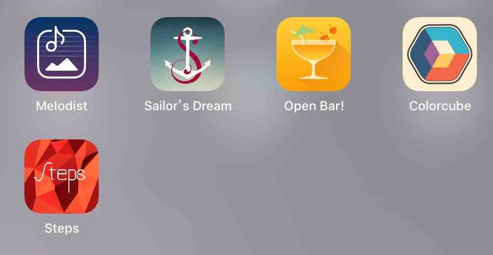 2.通过明丽色彩、舒缓音乐等方式缓解焦虑的游戏该类型游戏有 Melodist,sailor's Dream,Open Bar,Colorcube,steps,游戏图标如下图截图所示。其中,「 Melodist」严格意义上不算游戏,它根据图片生成音乐。「 Open Bar」和「 Colorcube」是比较普通的益智休闲游戏,但胜在画面与游戏体验。「Sailor's Dream」不多说, Simogo AB的一系列游戏都值得收藏。「 Steps」的玩法别致,以双指作脚,漫步于屏幕,体验景色缓缓呈现眼前。