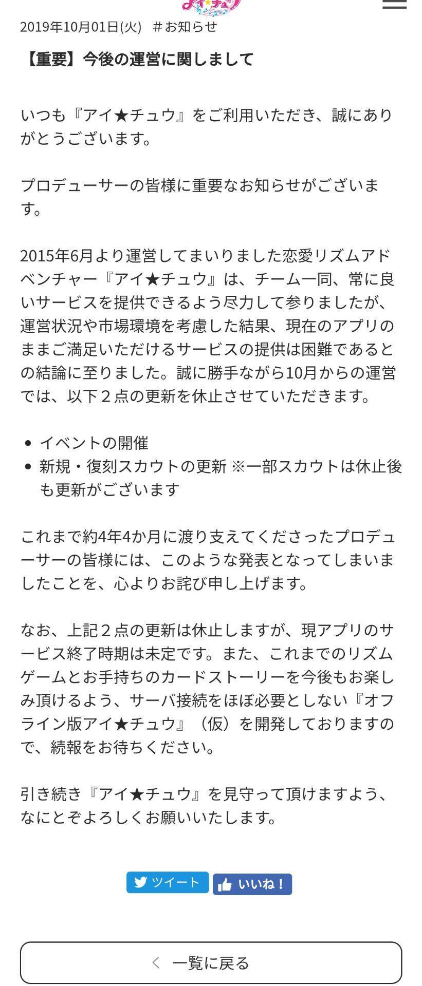从2015年6月开始运营的恋爱节奏游戏《I★CHU》,考虑到运营状况和市场环境的结果,得出了根据现在APP提供的满意服务很困难的结论。在10月开始的运营中,将会停止以下2点更新: