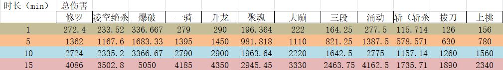 然后是算了一下不同时间副本完美环境各技能总伤害
