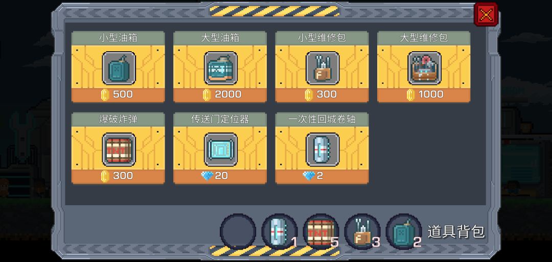 道具:大小修复(恢复生命,没用过,可以带几个小的备用),大小油箱(恢复油量,小的恢复500左右,可以带几个小的),炸药(个人常用,垂直下挖冲刺深度必备,可以摧毁你所在格子的周围八个格子,可以搞定岩浆落石和虫子,周围格子的矿也会被采集),大小传送(2钻小传送回城,一次性,不可返回原位置;20钻大传送建立传送门,永久性,可以通过传送门返回原位置,最多可以存在两个,100钻可以永久增加一个,在传送门处删除)。道具最多带五种,每种最多五个(大传送(可带未设置的传送门数)和炸药(十个1.0.10版本已经改为20个)除外)。