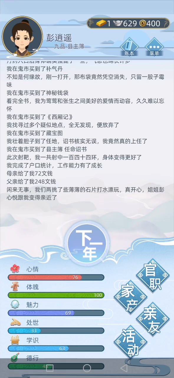 第一次玩 然后遇到一个很神奇的事件 我本来在读书 找方丈聊天 然后我出家了 出家后遇到鬼市 然后!我看到有个官职我就买了 结果。。。现在是这个状况
