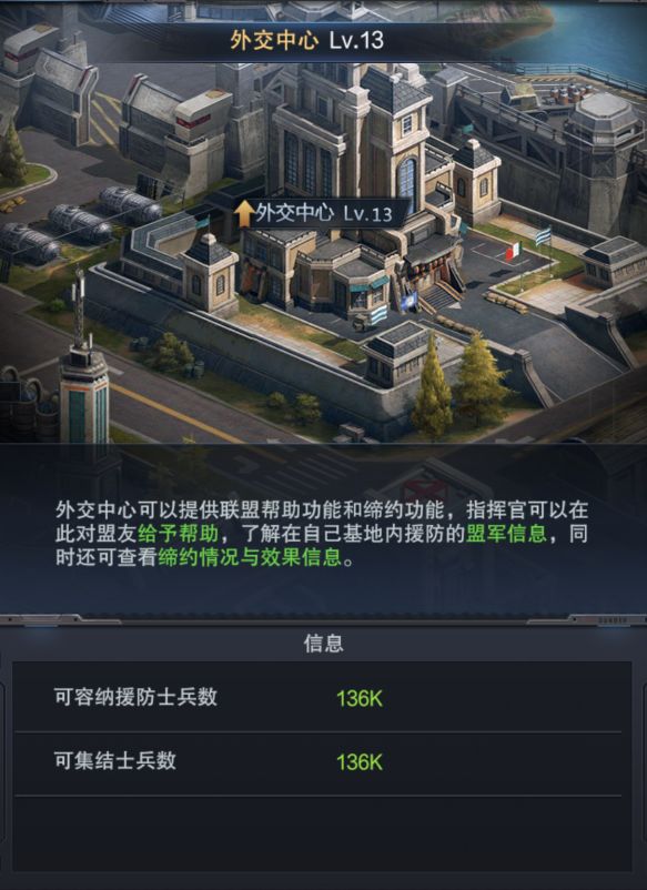 外交中心最大的作用就是配合盟友集结进攻或防守。集结的兵数与外交中心的等级有着直接的关系,外交中心等级越高,可集结的兵数就越多(援防也是如此),不过每次集结只能容纳8支军团。援防也是类似,外交中心等级越高,所能容纳的援防兵力就越高,在防守敌方的进攻时是至关重要的。