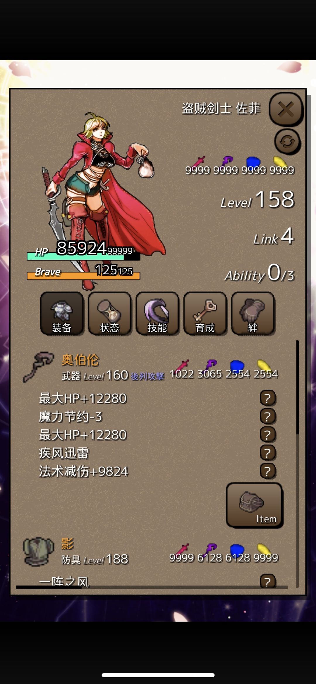 盗贼佐菲,不必多说,人人吹的神角,前期开荒不如飞鹰剑士这般舒服,没有望远镜和buff的支撑下开图开不到什么东西。但是这个角色能大大提高你角色的上限,辅助用佐菲通关的话属性能高飞鹰剑士一倍。