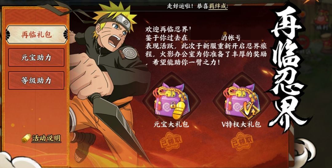 如果是新玩家去玩这个游戏之前最好随便去一个区,玩到30级以上,然后等七天以上(我不知道7天可不可以,反正7天以上最保险),七天不上线后去新区,就会获得再临忍界,直接送V6,还送不少绑金(等级越高,绑金越多)