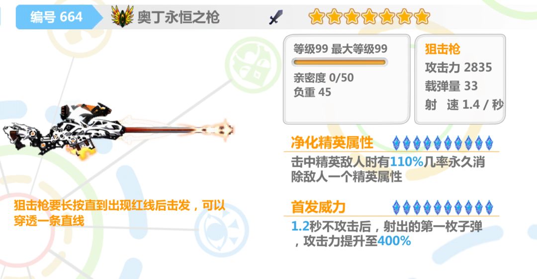 一技能清除精英技能这点在18.19村还是不错的,可惜狙击枪的本身的缺陷使得这把武器注定不能成为主力,在某些关卡用用还凑合。总之中规中矩,不用强氪,抽到嘛,也可以换碎片啊。
