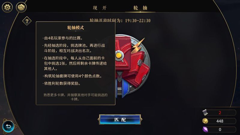 与传统TCG一样,游戏也有竞技场模式,分为:现开和轮抽。