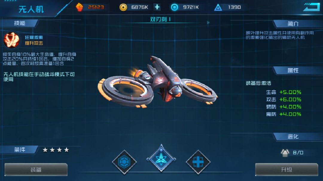 突破四星可以装备(双刃剑)无人机,主要功能是损失自身生命换取下次攻击的增伤效果。