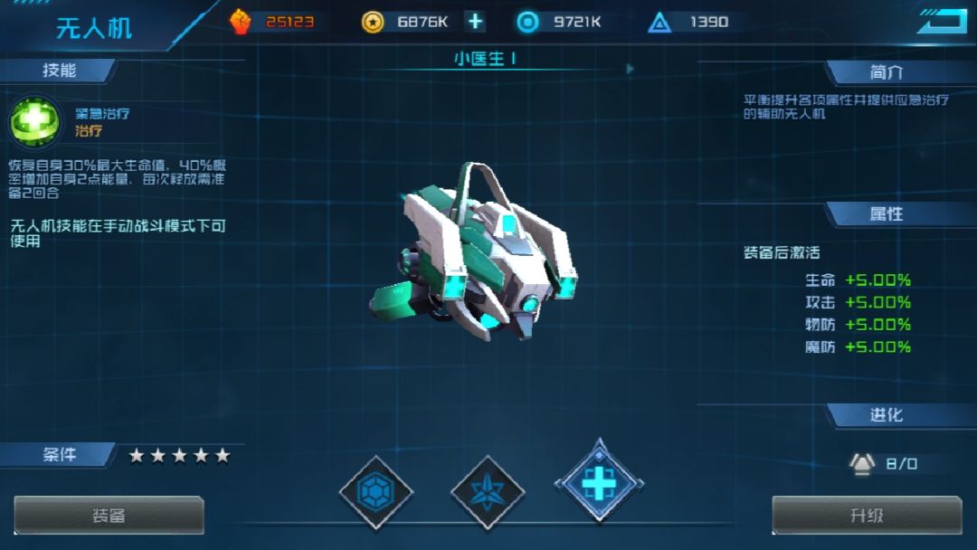 突破五星可以装备(小医生)无人机,主要功能是加血,额外回复能量!