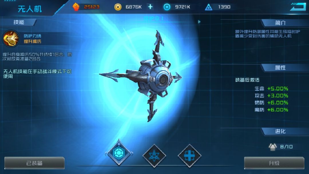 主角跟S女神突破到银色三星就可以装备(保护伞)无人机,主要功能是减伤。