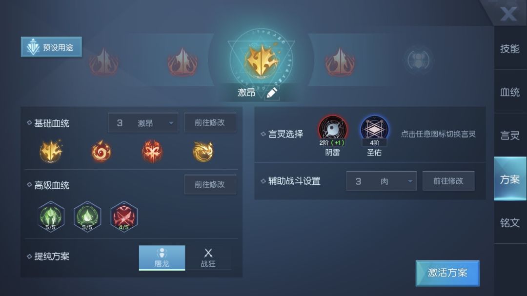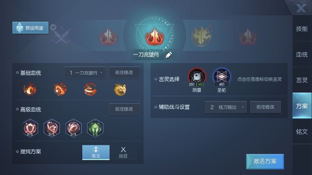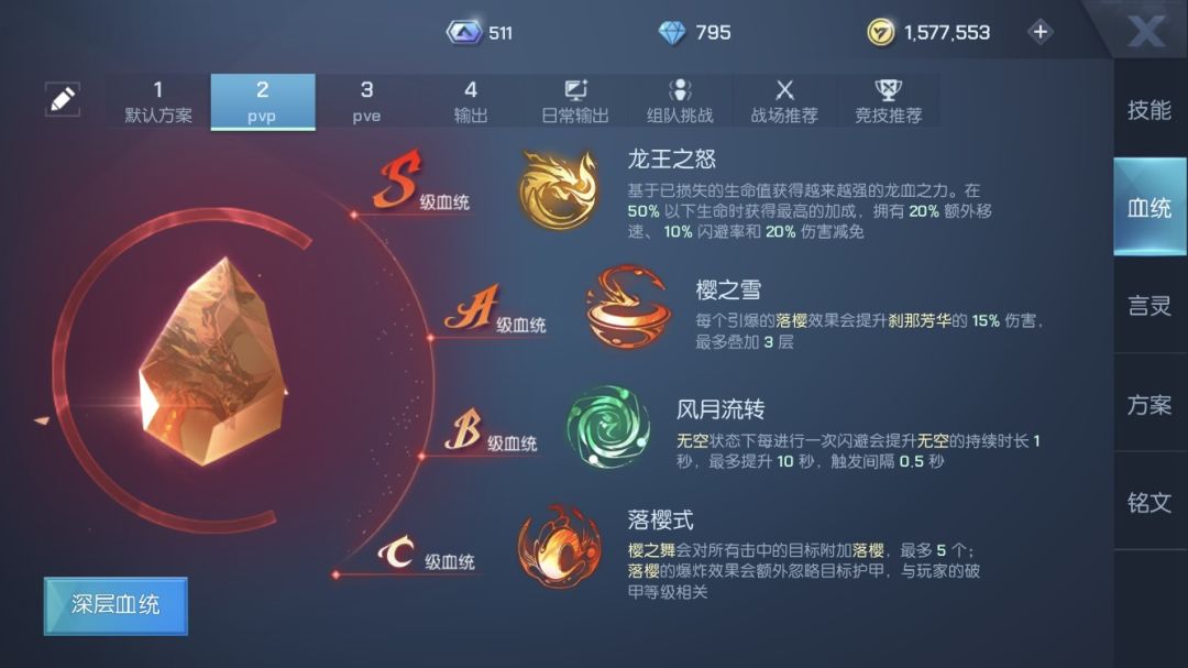 龙王:龙王这个血统还是挺好用的,pvp也用得到,龙王附加的20%移速和10%闪避可以让对手很难逃脱,打到你身上空无霸体还附带反伤效果,风月延长了霸体时间,相当于有一个半村雨在和你对打,龙王的20%免伤、格挡的30%减伤、圣佑的20%减伤可以让复活流的对手绝望。