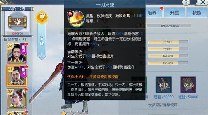 王破就是用刀的行家,他的绝技一刀灭破自然也威力无穷。施展一刀灭破可以对目标造成伤害,并且随着目标生命值低于一定百分比,伤害会持续提升。一刀灭破这个单体伤害绝技没有其他附带效果,有的仅仅是伤害效果,但正因为如此一刀灭破的单体伤害才非常恐怖。往往在单挑中,一旦目标血线较低时,一刀灭破往往可以一刀秒到对方,在BOSS或者首领战斗中,一刀灭破也可以对血量较低的目标打出极高的单体伤害效果,加快击杀速度。