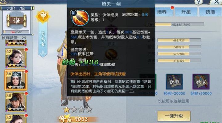 燎天一剑是苟寒食的伙伴绝技,是离山小师叔苏离所创的秘剑。施展燎天一剑会造成三次法术伤害,并且有概率附加4.5秒的眩晕效果。随着绝技等级增加,伤害和眩晕概率都会提升。燎天一剑其实与国教真剑效果相似,但是伤害次数降低,眩晕时间增加一半,所以是一个注重控制并兼顾伤害的单体伙伴绝技。