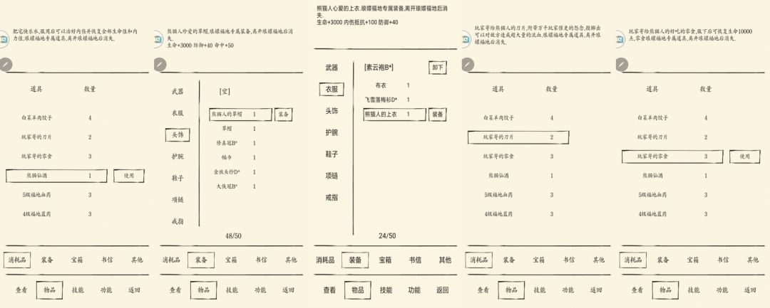 ⑤:藏宝阁:里面有熊猫人的各种宝物,进去后每一次只能带走一件物品,左下角葫芦可以获得熊猫仙酒,右下角帽子,衣服分别对应熊猫人上衣(生命+3000 内伤抵抗+100 防御+40)和熊猫人草帽(生命+3000 命中+50 防御+40),左上角深夜读物固定20金条 保险柜(里面可以获得熊猫人的存折,存折固定是1金条,熊猫人的零食,可以恢复1w血,玩家寄的刀片,相当于强性毒)