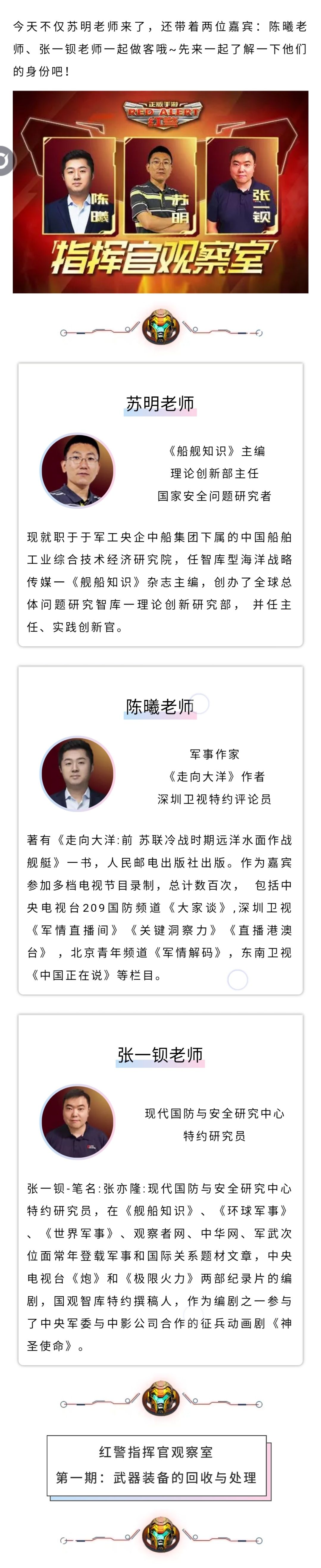 8月是红警军迷季,苏明老师邀请了两位重量级的军事大V伙伴来给各位指挥官带来七期的军事讲座,讲座的名字叫指挥官观察室,让大家在玩游戏的同时,也能了解到相关的军事趣事。