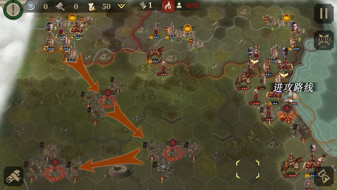 第三关:本关也比较简单,直接攻打位于地图中心的关键地区,打下来后右上方关键地区中的英雄甘尼克斯会主动进攻;击杀甘尼克斯后左下角的关键部队斯巴达克斯会主动进攻;击杀斯巴达克斯后配合队友将最后一个关键地区拿下即可。