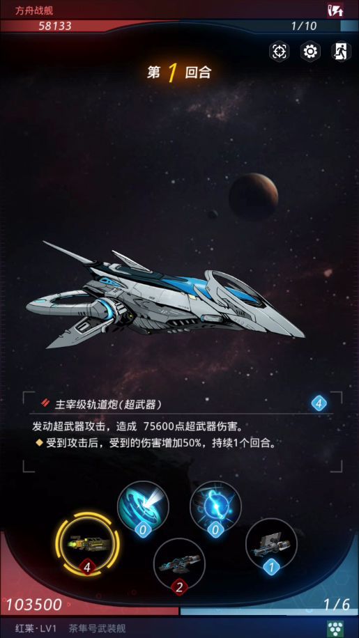 飞船技能与飞船搭载的装备一一对应,分别为——超武器攻击、主武器攻击、副武器攻击、蓄能和防御。每回合根据双方飞船施放的技能判定回合胜负。