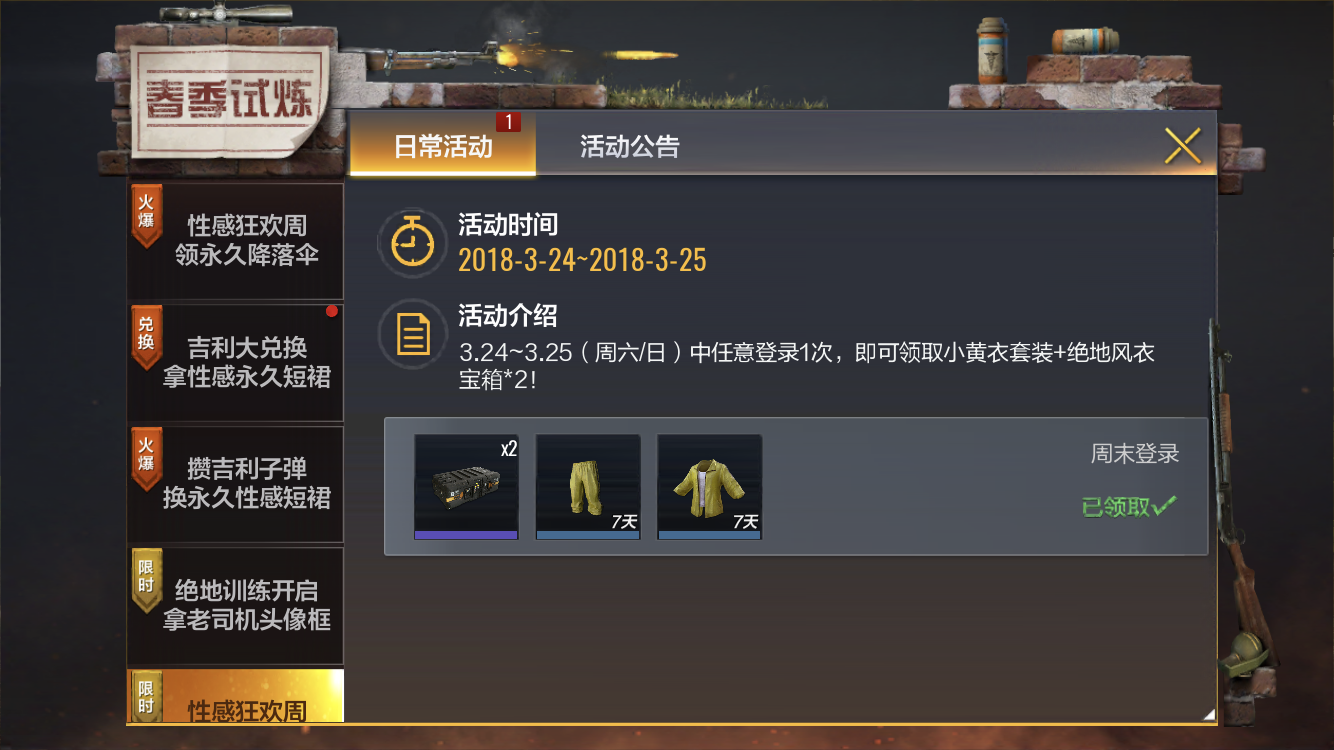 周末登录游戏一次,即可领取绝地风衣宝箱*2、黄色运动裤(7天)*1、黄色运动外套(7天)*1。