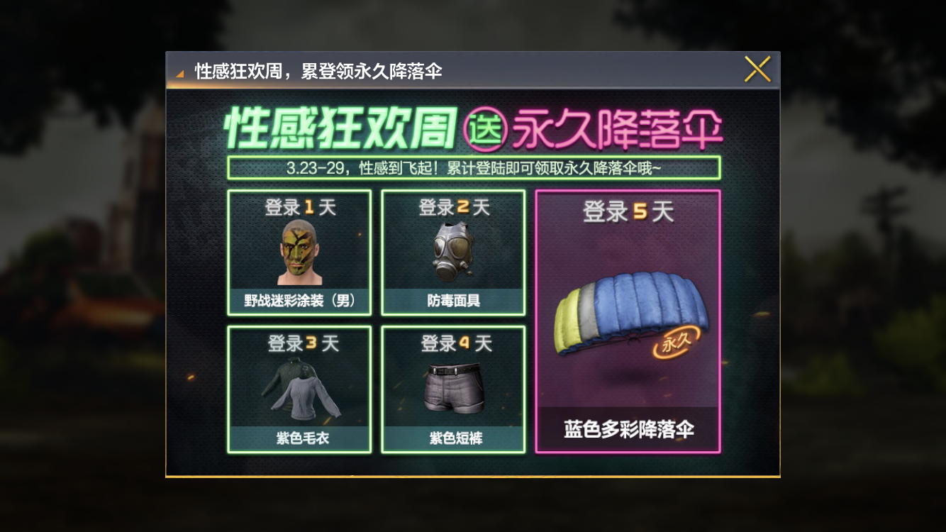 活动期间累计登录游戏,即可领取永久蓝色多彩降落伞!