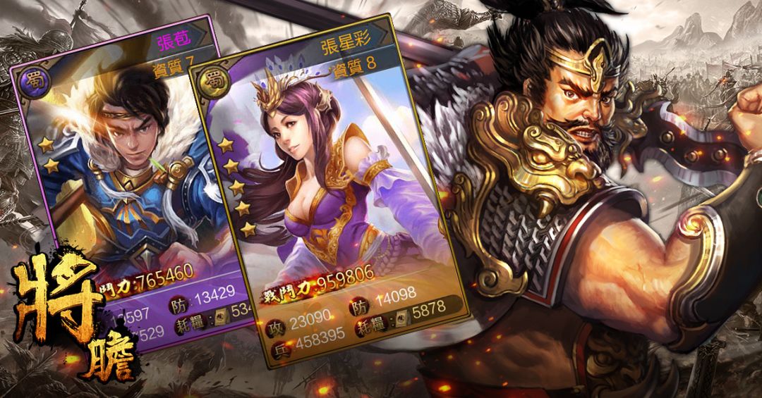 張飛常常被描寫為銅鈴大眼的彪形壯漢,長坂坡一吼威震天下,成為後人傳頌的美事。他的兒子張苞繼承了父親的家傳蛇矛,在戰場上繼續發光發熱;女兒張星彩在歷史上成為蜀漢皇后,在《將膽》中則與父親、兄長一樣,在戰場中為主公效命!同時擁有這三名角色,可在張苞與張星彩的羈絆頁面中升級「鬥神血脈」效果,同樣可以強化攻擊力,軍隊整體戰鬥力將大大提升,絕對不能錯過任何觸發羈絆的時機喔!
