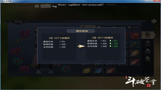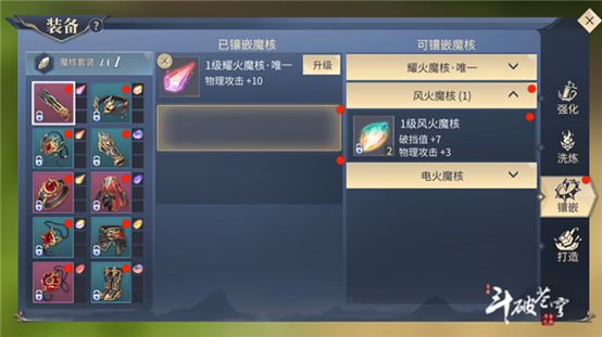 下面我们来看看普通魔核搭配。1.武器,两个风火魔核(1级破挡加7,物理攻击加3)项链,两个火魔核(1级物理攻击加5)戒指,两个幻火魔核(1级物理攻击加5)护符,两个光魔核(1级元素攻击加4)玉佩,两个幽冥魔核(1级生命加120)头冠,两炎火魔核(1级暴击加3,物理攻击加3)护手,两个暗木魔核(1级生命加62,元素防御加4)衣服,两个水魔核(1级生命加120)腰带,两个水土魔核(1级生命加70,格挡加7)鞋子,两个暗石魔核(1级元素防御加5,抗暴击加3)。我们这样搭配就好。