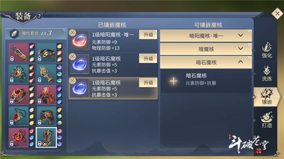图中我们可以看到,我每件装备,都装上了一个唯一性的魔核,武器,唯一魔核,耀火魔核(1级物理攻击加10)。项链,唯一魔核,焱火魔核(1级最大物攻加20)。戒指,唯一魔核,炎魔核(1级暴击加14)。护符,唯一魔核,耀光魔核(1级元素攻击加7)。玉佩,唯一魔核,阳魔核(1级物理防御加31)。头冠,唯一魔核,炎光魔核(1级暴击加8,元素攻击加3)。护手,唯一魔核,暗阴魔核(1级元素防御加9,法术防御加13)。衣服,唯一魔核,阴魔核(1级法术防御加31)。腰带,唯一魔核,石魔核(1级抗暴击值加14)。鞋子,唯一魔核,暗阳魔核(1级元素防御加9,物理防御加13)。当我们搭配完这些魔核之后就会激发属性,加1179的斗气,10个一级魔核,为一级魔核套装。