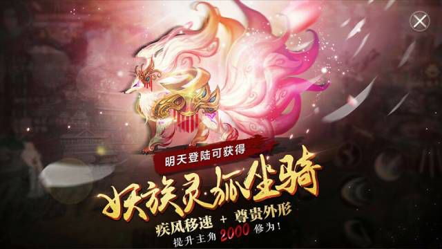 还有一件最重要的事情,已经连续登陆两天的同学,明儿就可以领取尊贵的妖族灵狐坐骑啦!不仅能增加移速,还可以提升主角修为,你值得拥有哦~