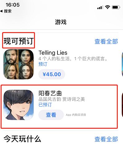 2.你也可以通过苹果商店首页的【游戏入口】,下拉到【现可预订】就能看到我们的游戏啦~