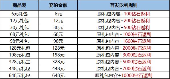 例如:小明在本次删档测试期间首次购买了648元钻石,正式上线后使用相同账号登录相同渠道的第一个角色可获得:5000钻(648元钻石奖励)+5000钻(首充赠送)+5000钻*2(2倍钻石返利),共计2W钻石返利。