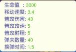 生命值:3000,移动速度:3.4,普通攻击:43,普通攻速:5普通射程:5,弹夹数量40,换弹时间:1.5
