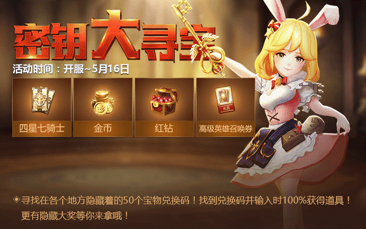 在国服正式开启倒计时三天的时间里,官方每一天都会爆料一则超级福利给各位玩家,今天重点福利推荐“密钥大寻宝”给各位骑士们啦!这次的密匙大寻宝活动时间从开服会一直持续到5月16日,活动期间,玩家通过收集(50个)宝藏密钥,在游戏内的活动页面就可以兑换奖励哦。这次活动的奖励非常丰厚,骑士大大赶紧准备参加呀!