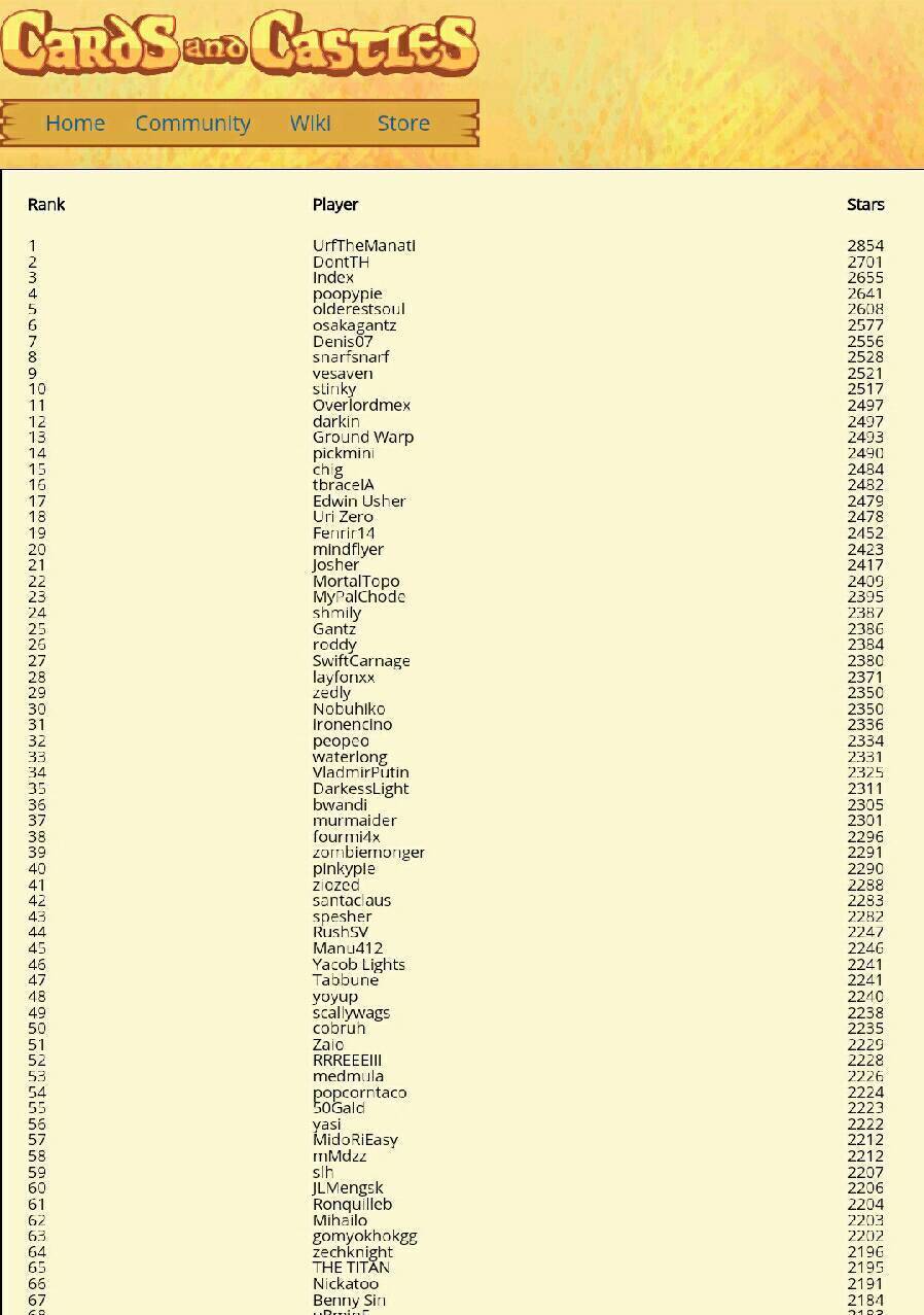 这是我的ID,大家可以加我,我是高二开始玩的,现在大一。附上查询rank排名的链接:https://www.cardsandcastles.com/v2/rankings/