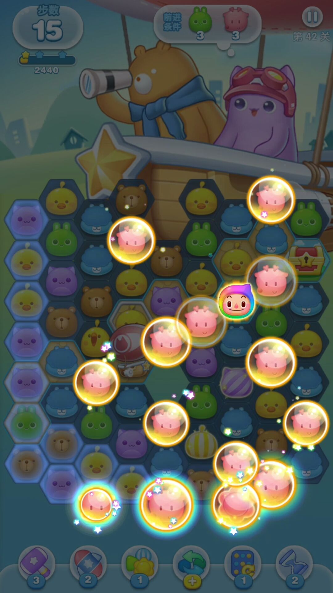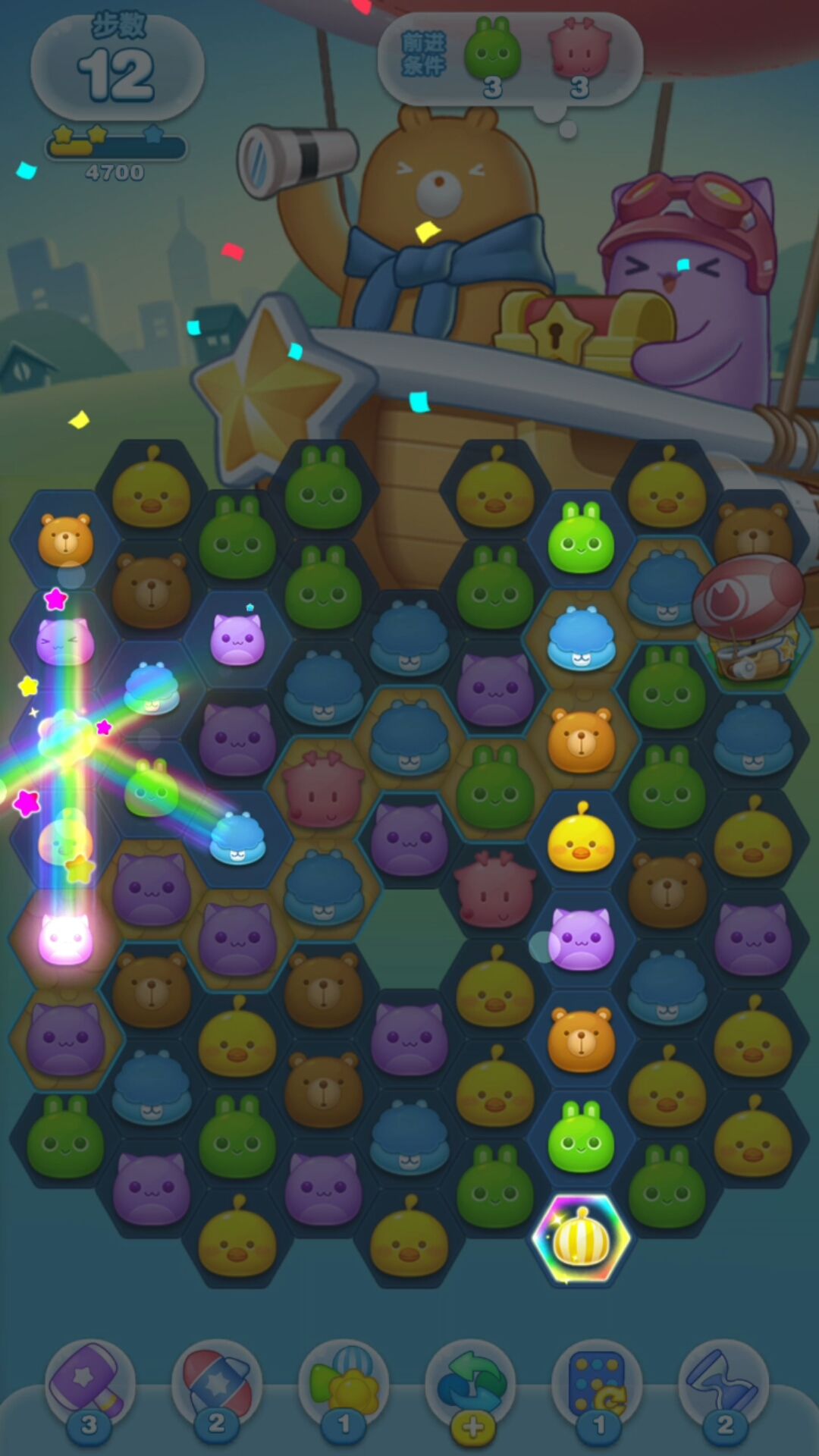 由于玩家在《消除者联盟》中可以进行斜向的消除,因此多个小动物消除而产生的糖果炸弹也在传统消除游戏的基础上进行了创新。