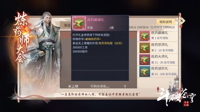 前100名都可以获得工资、银币和炼药师袍服奖励,名次越高所获得的奖励越丰富。