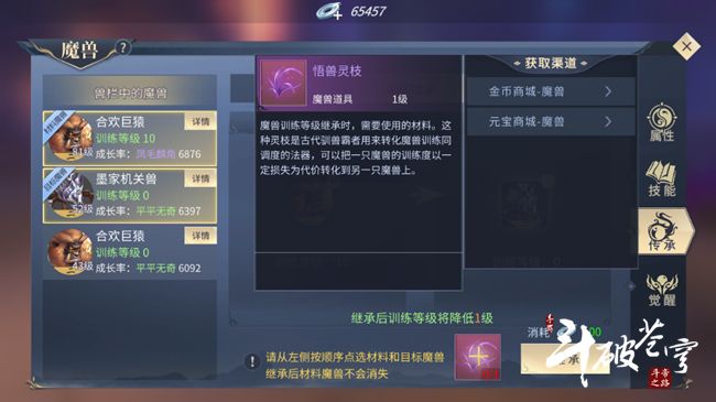 训练等级同样也可以传承,传承消耗的悟兽灵芝也可以通过金币商城用1000金币购买。原魔兽的训练等级到达5级,在继承时训练等级就会掉级,所以在更换魔兽时,要先继承再进行训练。