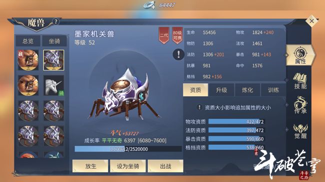 首先从资质上来说,合欢巨猿与小吞天蟒满资质是1564,墨家机关兽满资质为2264,相差700资质。资质大小影响追加属性的大小,资质越高,训练后增加的属性也就越高。