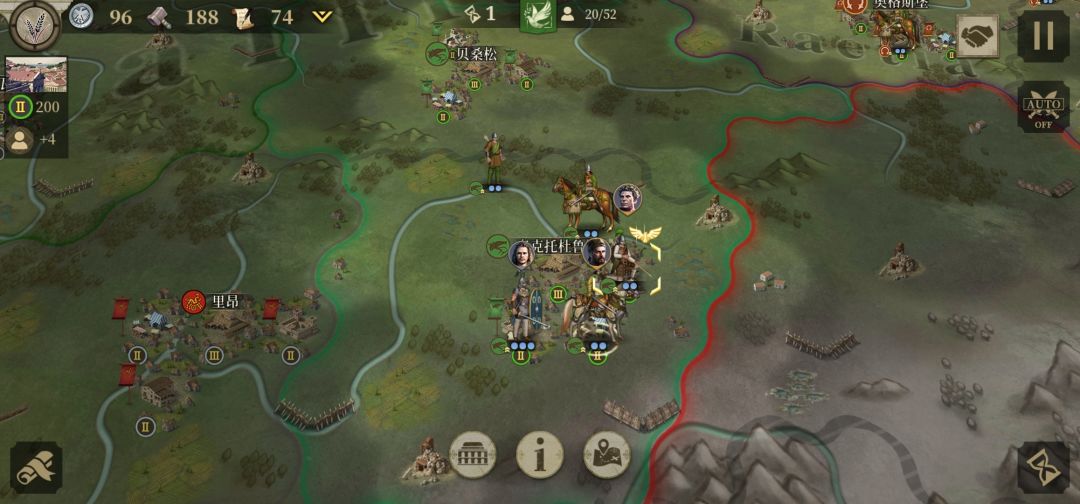 布立吞开局不升人口直接外交,外交花费跟你收入有关,我方的达西亚、苏维会、阿维尔尼、沃尔卡各外交一次,如果没有好将推得慢可以外交敌方马萨利亚、艾杜维各一次,然后直接推掉门口两家(西甘布尔.特雷维里),基本上大局已定了。