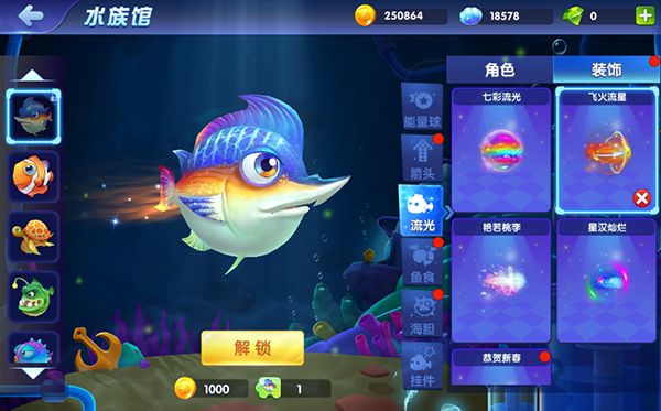 流光是除了皮肤之外最显眼的装饰了,装备了流光之后,战鱼的屁股后面就会拖出一道尾迹,形成飞驰电掣的视觉效果。所以很多小伙伴都喜欢装备流光,就算速度没有变快,吓也把对方给吓死了。目前游戏中的流光一共有五种,分别是七彩流光、星汉灿烂、飞火流星、恭贺新春和艳若桃李。